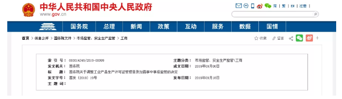 国务院印发《关于调整工业产品生产许可证管理目录加强事中事后监管的决定》